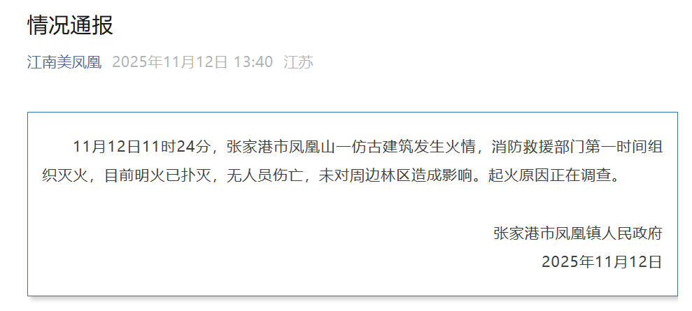 11月12日电 据“江北好凤凰”Wechat大众号新闻,11月12日11时24分,弛家港市凤凰山1仿古修筑爆发水情,消防抢救部分第偶尔间构造熄灭,今朝亮水已袪除,无职员伤殁,已对于周边林区形成感化。生气缘故正正在看望。图片根源:“江北好凤凰”Wechat大众号截图